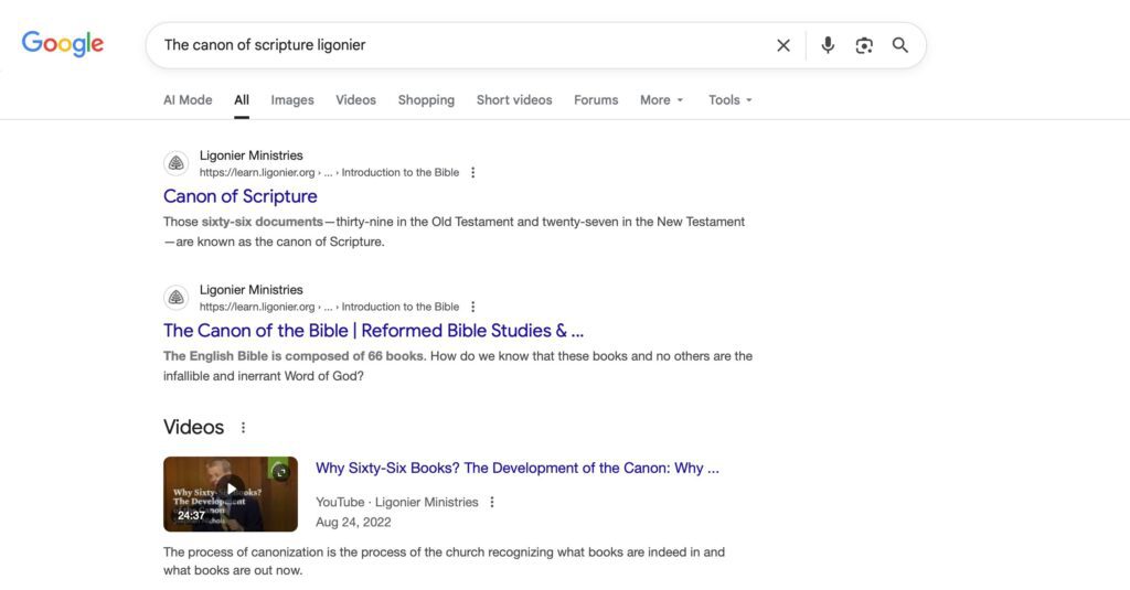 If you’re studying a topic like “the canon of Scripture”, simply type that into Google along with the name of one of these sites—for example: ‘The canon of Scripture Ligonier.’ This will quickly give you content from these websites on that specific subject. An example how to do this is shown below: